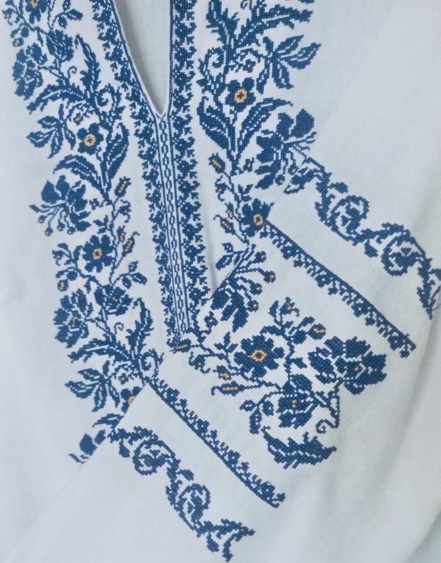 Лаконічна вишиванка українського бренду. тканина білий льон. вишивка хрестиком в синьо-жовтому кольорі, орнамент - квіти Довгі рукава на манжетах Розмір ХЛ Розмірна сітка на фото (за більш точними замірами звертайтесь)