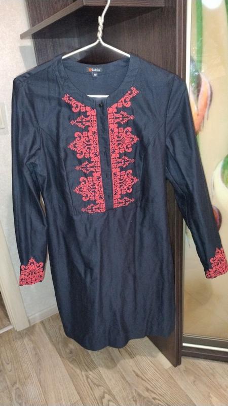 Сукня чорного кольору , тканина полірований льон, вишивка червоними нитками, приємна до тіла, українського виробника. На бірці розмір 50 але орінтуйтеся на заміри. Довжина 93 см, напОГ 46,напівобт 44, довжина рукава 60. Одягнена 2рази, ідеальний стан