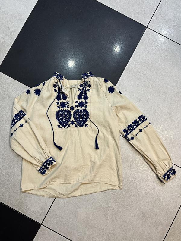 Дуже красива вишиванка з синьою вишивкою та китицями спереду, крій прямий. Купувала у сувенірному у Львові, носила лише раз, бо зрозуміла, що малий розмір. Вишивка машинна, виробництво Туреччина. Стан ідеальний. Розмір вказано L, але краще на М, щоб була вільна, бо це льон, тканина не тягнеться. Заміри: довжина виробу перед 59 см спинка 65 см рукав 65 см груди напів обʼєм 53 см