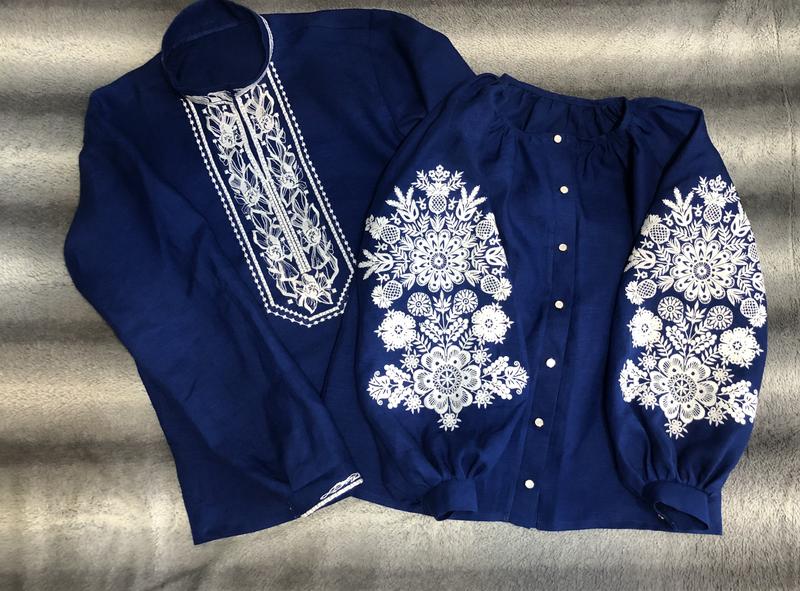Парні сорочки- натуральний льон Гарного синього кольору Вишивка машинна -акріл Якісна фурнітура Розмір м-л Чоловіча- пог 56 Ширина плечей 46 Довжина 72 Довжина рукава 66 Жіноча- пог 58 Поб 60 Довжина 64 Довжина рукава від горловини 70