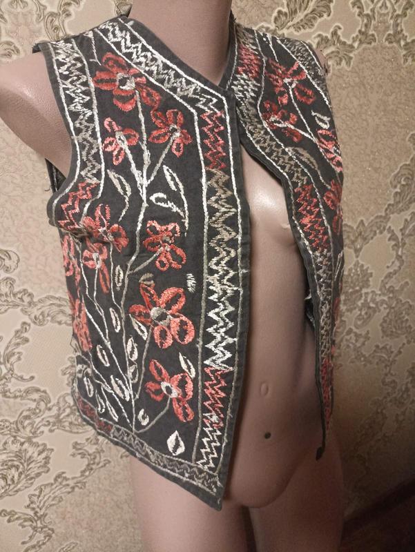 Цей вишитий жакет або короткий топ з вишивкою має характерний етнічний, бохо або український народний стиль, часто класифікується як вишиванка-жакет.