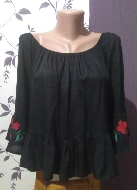Блузка з вишивкою на рукавах Rage 10-12 розміру, пошиття трапецією, верх на резинці, рукав не позначений ( реглан ) ПОГ 60 см, низ з ненав'язливою оборочкою - 63 см, довжина рукава від гумки 44 см, довжина виробу 52 см від плеча. Склад віскоза 100 %.