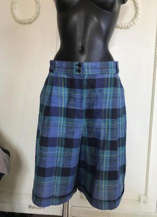 Шикарные стильные бермуды в идеальном состоянии. Красивая клетка, отличный фасон:высокая посадка, широкий пояс, есть шлёпки для ремня{широкие}, глубокие защипы спереди, два кармана. Состав:шерсть-2/, лён-27/, полиэстер-50/. Размер по бирке-42. Замеры:длина бокового шва -61 см, ПОТ-39 см, ПОБ-51 см, полуширина штанины внизу-39 см. Приехали из Австрии.