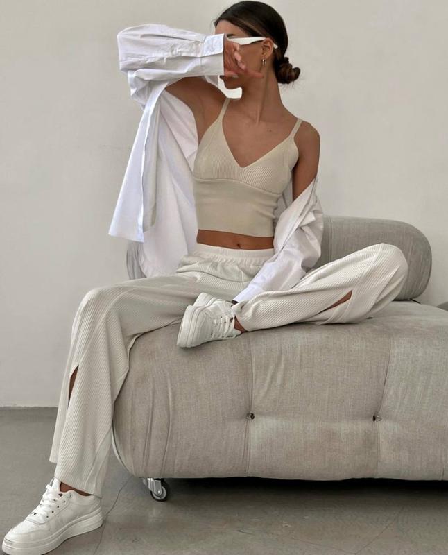 Штани з розрізами вільного крою. Висока посадка. Легка, якісна тканина. Довжина 110 см; Талія: 60-66см | 69-75см; Стегна: 88-95 см | 95-102 см; Колір: молоко;