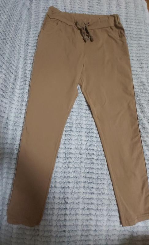 Продам штани. Довжина по зовнішньому шву 97, по внутрішньому шву 71, талія 38, розтягується до 46, стегна 48. Тканина тягнеться. Колір світло-коричневий.