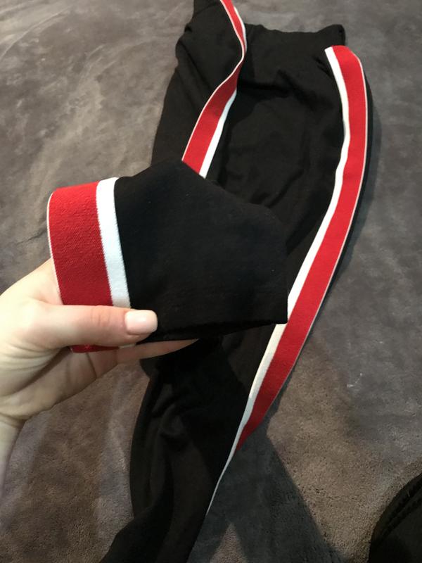 Брюки з високою посадкою, по бокам червоні вставки, йде з поясом, розмір М, одягала декілька разів, стан хороший, дефекти відсутні