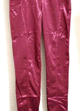 Штани скінні з гладкої тканини з ефектом переливу (рожево-фіолетовий) на стегна до 88 див. На тілі виглядають як на останньому фото
