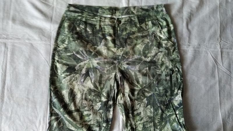 Натуральні,в листовий принт. 2 кишені спереду,блискавки та задні клапани-декоративні. ФОТО НА ТІЛІ НЕМАЄ. Довжина 105 НОТ 41/45 Посадка 29/33