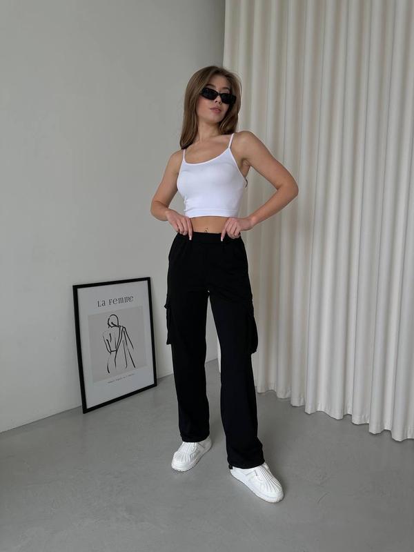 Карго А мод.080 Фото наживо !! @Розміри:42-44,46-48 @Тканина:двунитка @Кольори: чорний, хакі, мокко, молочн ий Хіт сезону , найпопулярніша модель.3 низу штани регулюються резинкою, мають дві кишені зверху та два накладних кармани . деальна посадка
