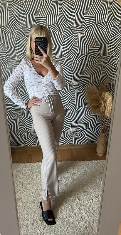 В наличии брюки из мягкого трикотажа в полоску. Высокая талия, эластичная талия, разрез внизу штанин.Размер XS.Полиэстер 61%, Вискоза 34%, Эластан 5% XS-длина 100см,пот 32см,поб 39см(ткань тянется)