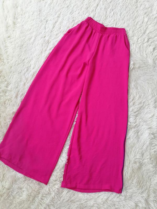 довгі широкі літні штани Палаццо з одним тоненьким лампасом тканина жниварка є бічні кишені талія на гумці яскраво рожевий колір малина фуксія