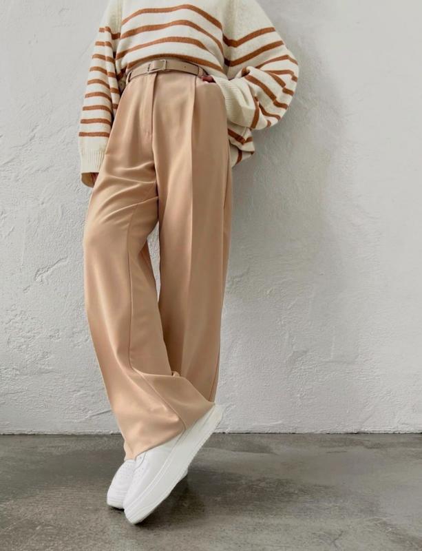 Брюки Модель 874 Виробник Україна Розміри 42-44, 46-48 Модель 1874 Виробник Україна Розміри 50-52,54-56 Тканина брючна костюмна Склад: 55% віскоза, 42% поліестер, 3% елаcтан Однотонні штани палаццо в найактуальніших кольорах* чорний, пісочний Модель має високу посадку, защипи спереду, стрілки по всій довжині та кишені з двох боків. Застібаються брюки на блискавку та пояс з гудзиком. Ідеально сидять по фігурі, мають трендовий крій та високу якість пошиву та матеріалів. Брюки палаццо вигідно поєднуються з топами та майками, блузами та рубашками, светром, кардиганом чи піджаком.