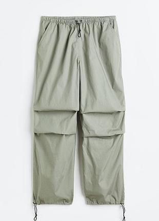 Штани із щільної тканини. Розмір L, але підійдуть на XL. На талії еластична куліска, діагональні кишені з боків, ззаду хибні кишені з клапаном. Складки з боків колін надають об'єму. Еластичний шнурок зі стопором унизу штанин.