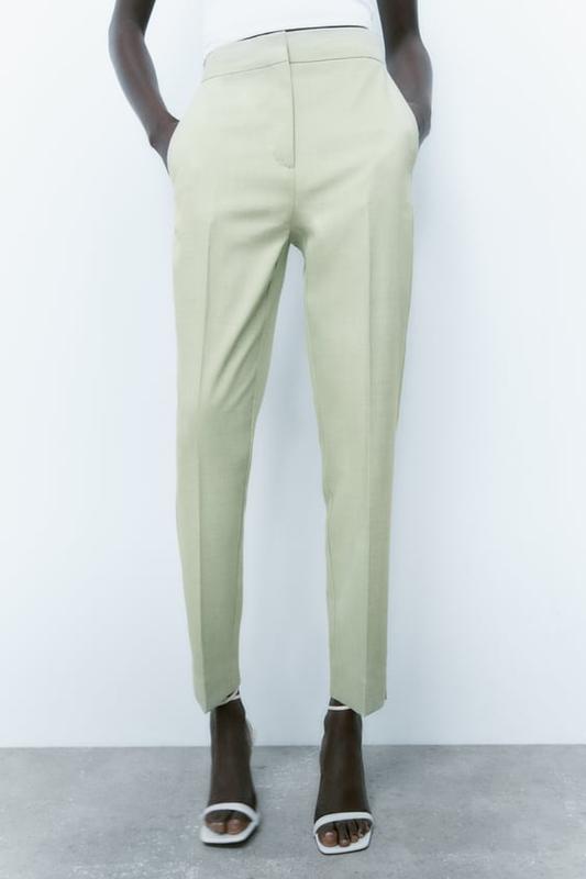 Штани із середньою посадкою та передніми кишенями. Задні прорізні кишені, розрізи з боків знизу. Застібка на блискавку, внутрішній гудзик і металевий гачок. ЗЕЛЕНЫЙ - 9929/030 Розмір 38/М ПОТ - 39 см ПОБ - 51 см посадка перед/зад - 27-39 см довжина по зовнішньому шву - 96 см довжина по внутрішньому шву колоші - 68 см ширина штанини знизу - 17 см