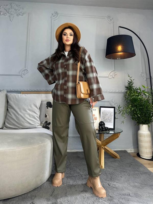 Брюки Талія на резинці Посередині декоративний шов Тканина: екокожа на трикотажі Колір: чорний, олівка і коричневий Розмір: 42-44(1),46-48(2) Ціна: 660грн Розмір: 50-52(3),54-56(4),58-60(5) Ціна: 710 грн Замїри виробу 42-44 Довжина 110 см Талія на резинці в нерозтягнутому виді 60 см ПОстегон 52 см 46-48 Довжина 110 см Талія на резинці в нерозтягнутому виді 65 см ПОстегон 56 см 50-52 Довжина 110 см Талія на резинці в нерозтягнутому виді 70 см ПОстегон 60 см 54-56 Довжина 110 см Талія на резинці в нерозтягнутому виді 75 см ПОстегон 65 см 58-60 Довжина 112 см Талія на резинці в нерозстягнутому виді 85 см ПОстегон 68 см яс
