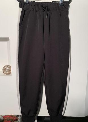 состояние идеальное черного цвета с белыми лампасами спорт- стиль известного бренда 85%полиэстер 15%эластан ткань средней плотности мягкая высокая посадка низ на трикотажном манжете замеры пот 37/47 поб 57 посадка 30/41 длина 101 шаговый 73 низ по 12