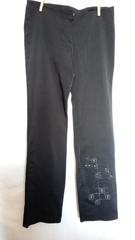 чорні,гарні,з вишивкою на штанині,довжина101см,півобхват пояс40см в спокійному стані,тягнеться43,бедра46,тягнеться52,