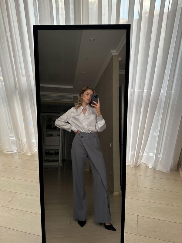 💙💛У НАЯВНОСТІ 💙💛Ультрамодні штани на запах. Модель 3286. Розміри: 42-44, 46-48, 50-52, 54-56 Тканина: костюмка Колір: чорний, сірий Прямі штани з ефектним асиметричним запахом спереду з костюмної тканини. Поєднуються з сорочками, футболками, світшотами та худи. Штани середньої посадки, з бічними кишенями. Застібка брюк на блискавку та гудзик, пояс ззаду на широкій резинці, для ідеальної посадки.