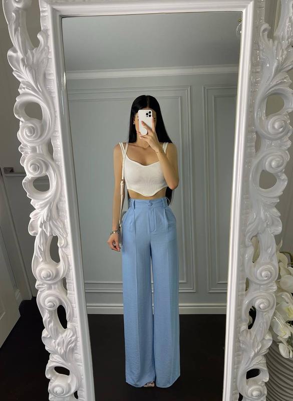 Штани ✅матеріал - льон натуральний ✅опис моделі - виконані з фактурною стрілкою, посадка завищена, дві робочі кишені ✅розміри 42, 44 ✅кольори моделі - чорний, білий, бежевий, блакитний, малина, жовтий, коралово-червоний, зелений