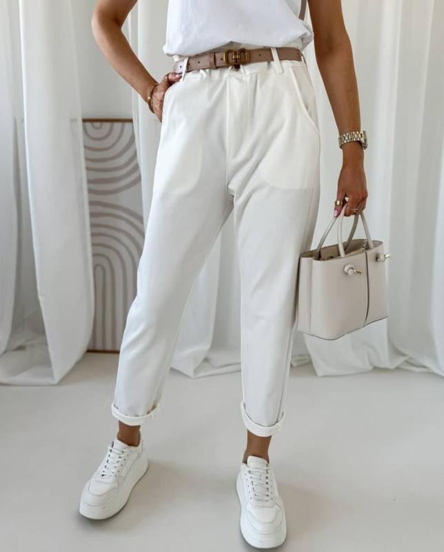 Класичні брюки - ідеальне рішення на теплу пору року. Пояс + 100 грн. Розміри: 42-44, 46-48. Тканина: костюмка. Кольори: чорний, беж, молоко.