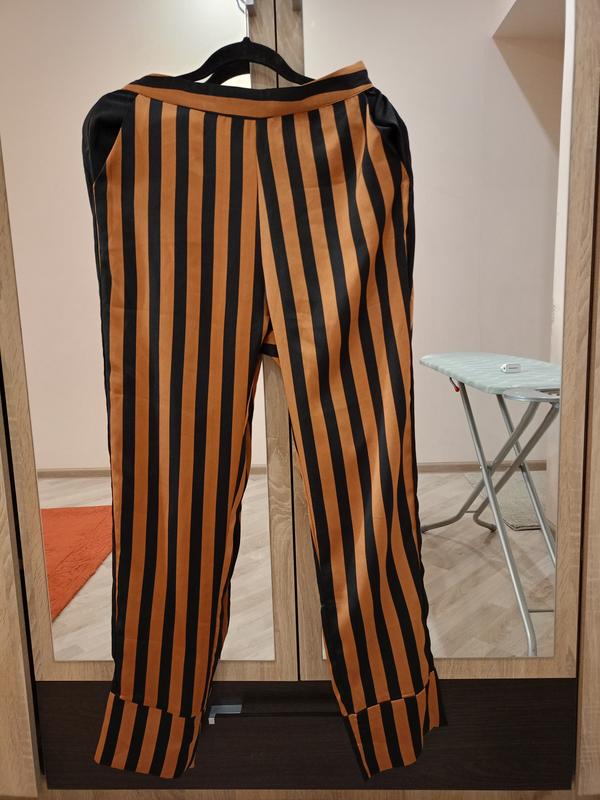 Акцентні цікаві брюки в білизняному стилі. По бокам карманчики. Тканина по типу атлас. Талія 68, але є позаду резинка, яка тягнеться, бедра 115, довжина 103 Зверніть увагу, внизу іде на кшталт манжети, але вона широченька