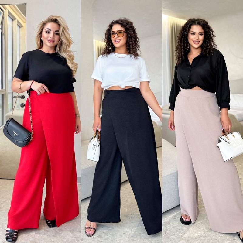 Модные брюки палаццо с эффектом запаха. Широкі, зручні! По талии сзади резинка. Материал лекгий, на лето супер 🌞🌞🌞 Мод.318 Цена 🇺🇦1100 грн Размеры : 48-50,52-54,56-58 Ткань: жатка которая дышит Цвет: черный, красный, мокко