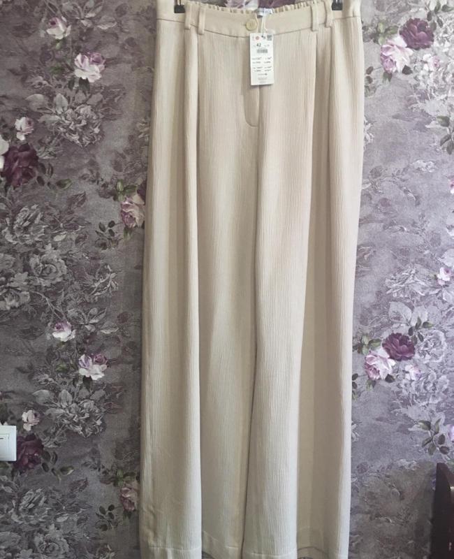 Жіночі штани Palazzo Rezerved Модель прямого крою - труби , широкі від талії . В талії застібається на ґудзик , ззаді резинка . Тканина звисаюча в рубчик . Спереду складки .Висока талія . ✅100% поліестер ✅Колір - мокко ✅Розмір : 42 ✅Заміри: ПОТ 44(тягнеться до 51);ПОБ 68; довжина 113; крок 84 ✅Польша