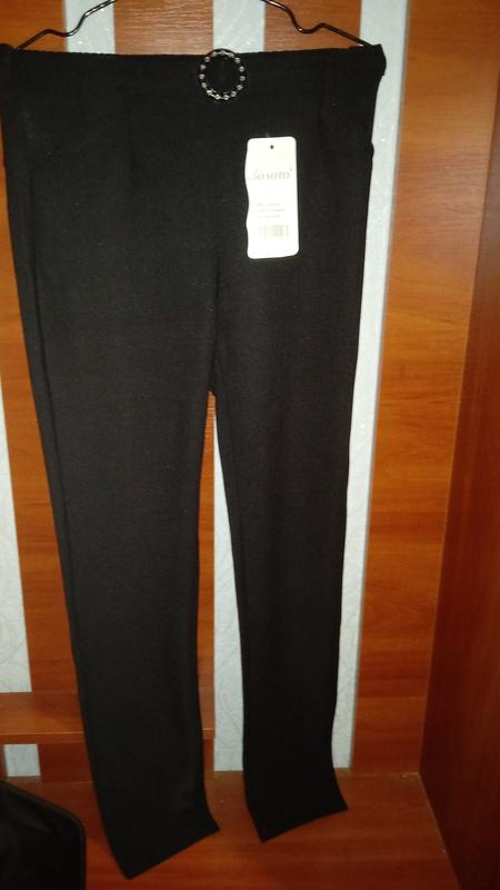 Брюки черного цвета.Йдут в утяжеление.Размер и материал указаны на фото.Поса не имеет.Имитация.Новые