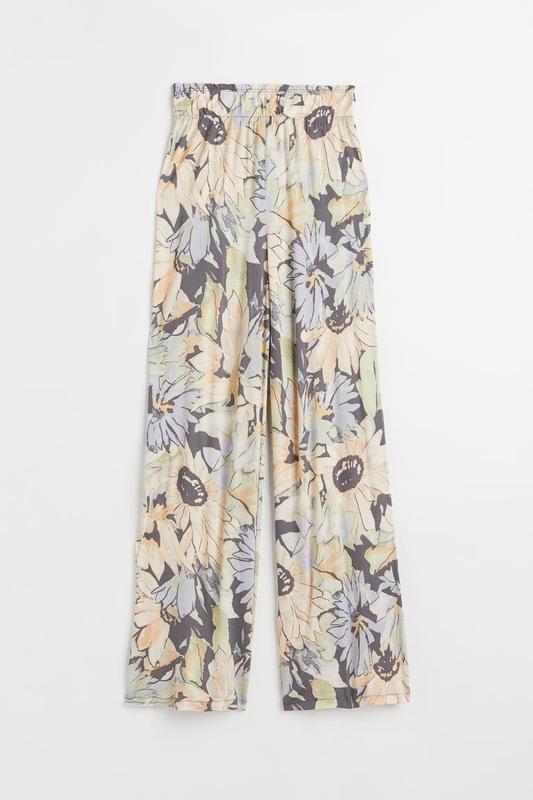 Трикотажная вискоза, широкий пояс на резинке, новые. ПО пояса - 47 см, тягнеться до 68 см. Длина с поясом - 105 см. Посадка - 38/46 Ширина брючини внизу - 36 см. Гарно тягнуться.