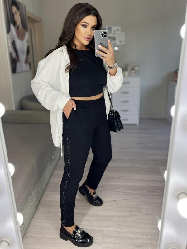 👑Брюки "Каминчики"⭐️ Модель: 102 ✔️Размер: 48-50, 52-54, 56-58, 60-62 ♥️Цена: 1300 грн 🍁Ткань: плотный трикотаж Алекс высокого качества 🟢Цвет: черный Брюки из качественного, плотного трикотажа. Ткань не скатывается, супер какие-то🔥 Декорированы камушками. Талия на резинке, высокая посадка. ✔️Замеры⬇️: 🟠48-50, ОС 105-112 см. ОТ 72/90 см. Длина изделия 103 см. Шаговый шов 77 см. 🟠52-54, ОС 113-120 см. ОТ 80/106 см. Длина изделия 104 см. Шаговый шов 77 см. 🟠56-58, ОС 120-128см. ОТ 84/118 см. Длина изделия 104 см. Шаговый шов 77 см. 🟠60-62, ОС 129-138 см. ОТ 88/122 см. Длина изделия 104 см. Шаговый шов 77 см.