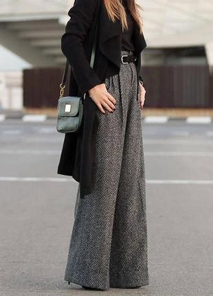 Брюки арт. gr. 8374 Розміри: 42-44, 46-48, 50-52 Колір: сірий Тканина: вовна ялинка Сезон: осінь, зима, весна Брюки класичні з кишенями, теплі на високій талії, мають стиль палаццо, вільні, неймовірно легко поєднати різними стилями взяття, верхнього одягу, класичними блазками, топами і худі, жакетом. Застібається в поясі на ґудзик, мають брючну блискавку. Ціна дроп/опт: 800 грн