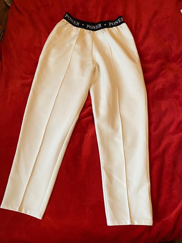 Білі штани зі стрілками, на резинці. Розміру на етикетці немає, але по вигляду хс-с. По довжині підійдуть на дівчину +/- 165 см