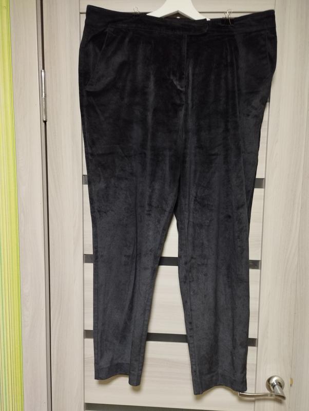 Штани. Женские. Размер 18. Наш 54. Тканина типу оксамит. Есть карманы. Застегивается впереди на пуговицу и молнию. 100% полиэстер. Ткань почти не тянется. Пояс 100. ПОБ 62. Длина изделия 99 см. В идеальном состоянии.