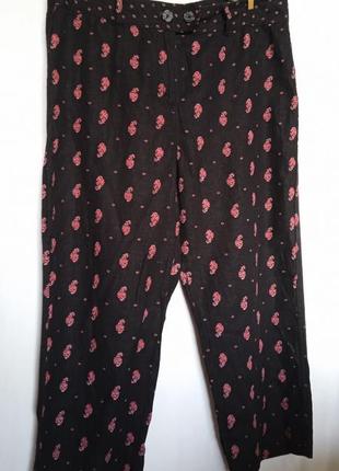 штаны красивые,натуральная ткань без синтетики, на черном поле розовые цветочки, длина93,пояс полуобхват45и тянется47,, бедра62-64,ширина штанины внизу25,тканная лен и вискоза,