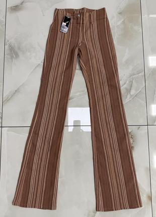 Класні штани кльош у смужку, нові. Розмір вказаний 40, йдуть на xxs-xs. Заміри: довжина 111 см, крок 86,5 см, посадка 24 см, ширина холоші внизу 23 см, угорі 22 см, ширина по талії 30 см, з боків 40 см, тканина тягнеться.
