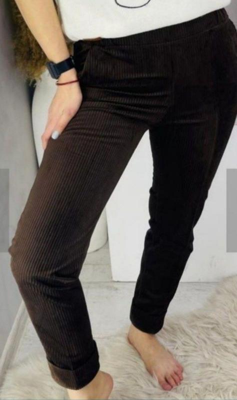 Нові брюки, шоколадного кольору з боковими кишенями. Довжина - 93 см., посадка - 28 см., ззаду- 32 см., ПОБ до 48 см., пояс - резинка тягнеться до 45 см.