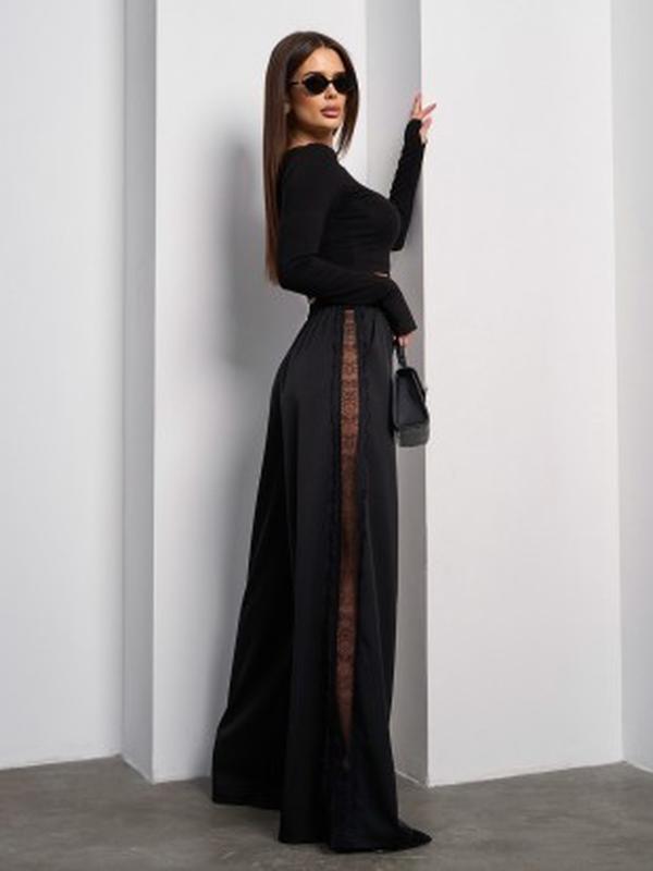 Арт: SA-596_Виміри Ми вимірюємо готові вироби! Щоб точно визначити розмір, зробіть заміри одягу сантиметровою стрічкою і порівняйте з таблицею. Напівобхват S M L XL Талія 30-36 32-38 34-40 36-42 Стегна 49 51 53 55 Довжина виробу: 109, довжина з внутрішнього шва - 80 Тканина: низька еластичністьМатеріал: Костюмка/мереживо Склад: 59%, поліестер, 21%, еластан, 20%, бавовнаЧорні штани широкого крою з поясною гумкою та кишенями. Модель з костюмки з високою посадкою на талії та бічними мереживними вставками.