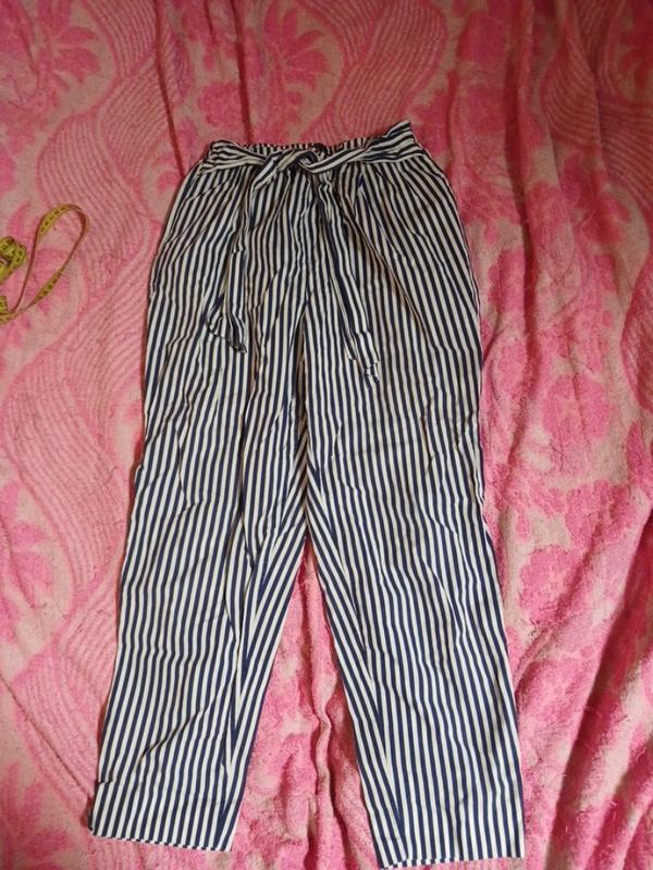 Брюки котонові в ідеальному стані.Виробник Туретчина. Довжина 90см,ширина поясу в не розтягнутому стані 31см,в розтягнутому 42см, глибина з під поясу30см, ширина пів бедер 52см, ширина в низу 16см. Ціна 100грн
