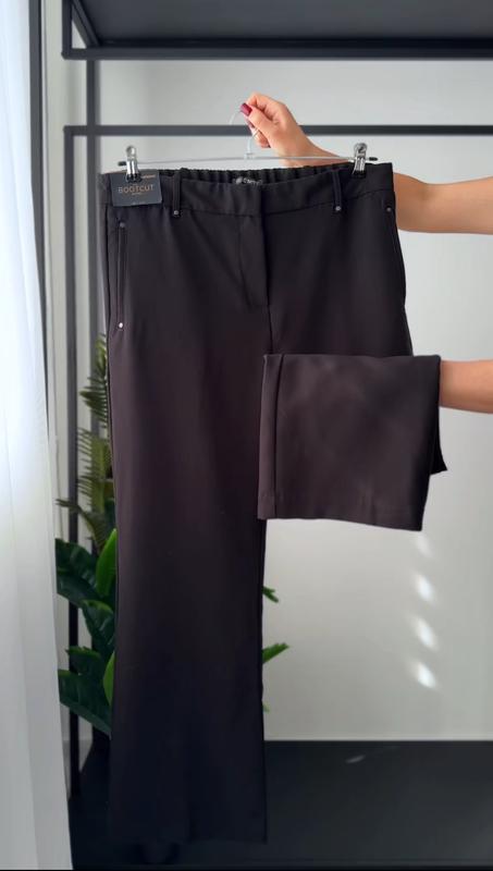 Штанці BOOTCUT з високою посадкою N E X T 79% POLYESTER 17% VISCOSE 4% ELASTANE Якість ✔️ Тягнуться ✔️ Номер: 967 Стан ідеальний з етикеткою Розмір: 18/XL Параметри пів обхват: Пояс: 45-53 см Стегна: 57-62 см Довжина: 100 см по шву 70 см Посадка с переду: 31 см Об’єм ноги: 34-36 см Колоша: 27 см