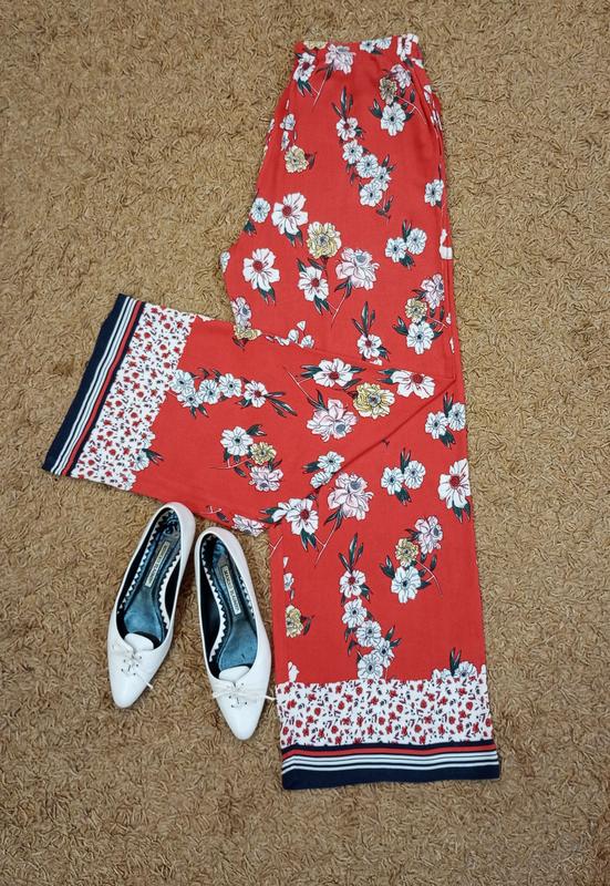 Брюки від британського модного та стильного бренду Nutmeg, що робить фокус на якісних натуральних матеріалах. Модель палаццо - широкі брючини, що вільно струмениться по стегнах, довжина "у підлогу". Широкий пояс, на спинці еластичний, від поясу невеликі защіпи. Для максимально розслабленого образу дві бокові кишені накосу. Неймовірно свіжий та соковитий принт у квіти. Низ брючин - купонний. Колір - червоний (не яскравий, з ефектом washed out) з білим та синім. Розмір - 12. Довжина - 107 см. Довжина по кроковому шву - 75 см. Об'єм талії (в стягнутому стані) - 76 см. Об'єм талії (в розтягнутому стані) - 82 см. Об'єм стегон - 110 см. Ширина брючини - 28 см. Тканина - віскоза (100%). Країна виробництва - В'єтнам.