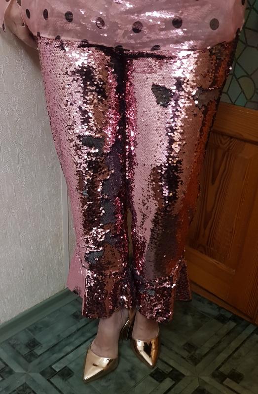 Брючки з тканини з блискучих паєток , можуть бути рожевими або сріблястими, або рожевосріблястими, а залежності від напряму паєток, в середині є підкладка штанішки див. фото, застібка потайна молнія на боку, обхват талії 76см, обхват бедер 95см, посадка спереду 36см, посадка ззаду 44см, шаг 64см, довжина 99см.