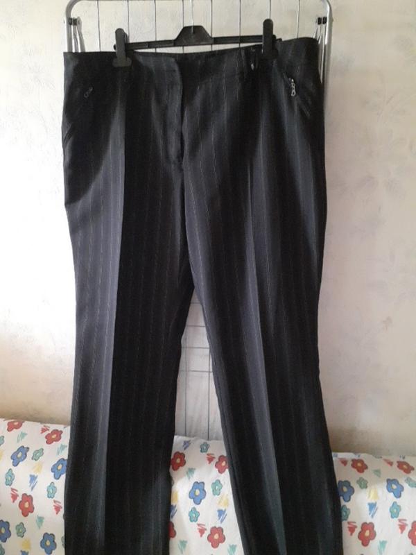Класичні жіночі штани в смужку від Maria Reich для пишної дами. Бічні кишені на блискавці. Довжина по бічному шву 107 см, напівобхват талії 52 см, напівобхват стегон 64 см. Тканина трохи тягнеться. Майже не мнуться. Крок спереду 30 см, крок ззаду 42 см.