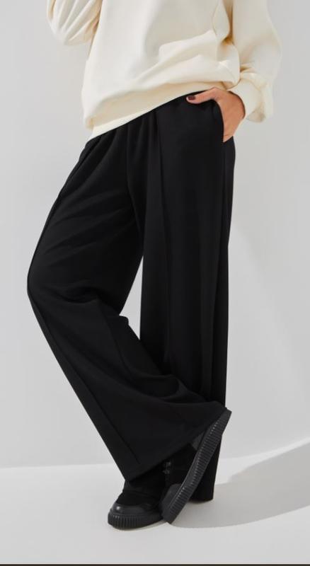 Штани жіночі палаццо з мікровельвету чорного кольору Італія Насичено чорного кольору БУДЬ ЛАСКАДЕООБОР! Універсальна та трендова модель стане улюбленою базовою річчю вашого гардероба. М'яка фактурна тканина добре тримає форму та водночас забезпечує максимальний комфорт у русі. Модель має еластичний пояс зі шнурком, зборочки, глибокі кишені й акуратне широке оздоблення внизу. Штани легко поєднуються з базовими топами, светрами, лонгслівами або сорочками, утворюючи сучасний силует у стилі спокійного мінімалізму. Підійдуть на ОС 100-118 см в талії гумка, дуже добре тягнеться на будь-які обсяги від 75 до 110 см Довжина 103 см Ширина штанини внизу 41 см Склад 98% котон 2% еластан Ви однозначно залишитеся задоволені покупкою! Будьте неповторні!