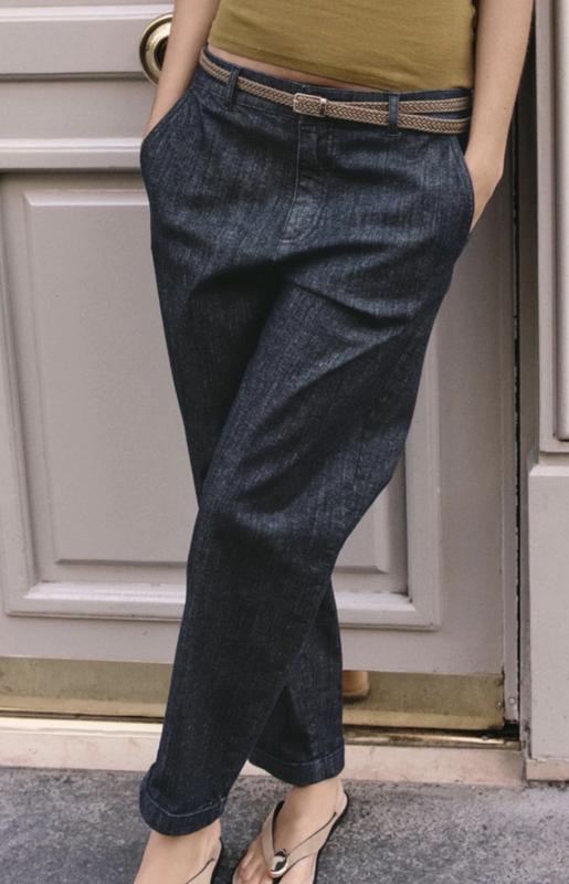 Джинсові штани-чіноси від ZARA з плетеним ременем. Класичний синій колір. Виготовлені з деніму - натурального матеріалу. Вказаний 34 (хс), купувались на 36 (с). Штани із середньою посадкою. Кишені спереду та імітація кишень з обшивкою ззаду. Закоти внизу, плетений ремінь на поясі. Застібаються на блискавку та ґудзик спереду. Купувалися для ділового луку проте у носці не були. Попередньо бірка та інформаційна книжечка вшита всередині була відрізана тому віддам за зниженою ціною - чіноси НОВІ