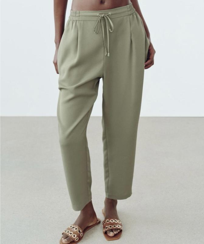 Легкі жіночі штани , брюки Zara. Пояс на резинці, регулюється шнурком, по боках кишені. Розмір S, може бути як М дивіться на заміри НОПояса 37-42 см висота посадки 28 см зовнішня довжина 89 см внутрішня довжина 59 см Вихід 15 см.