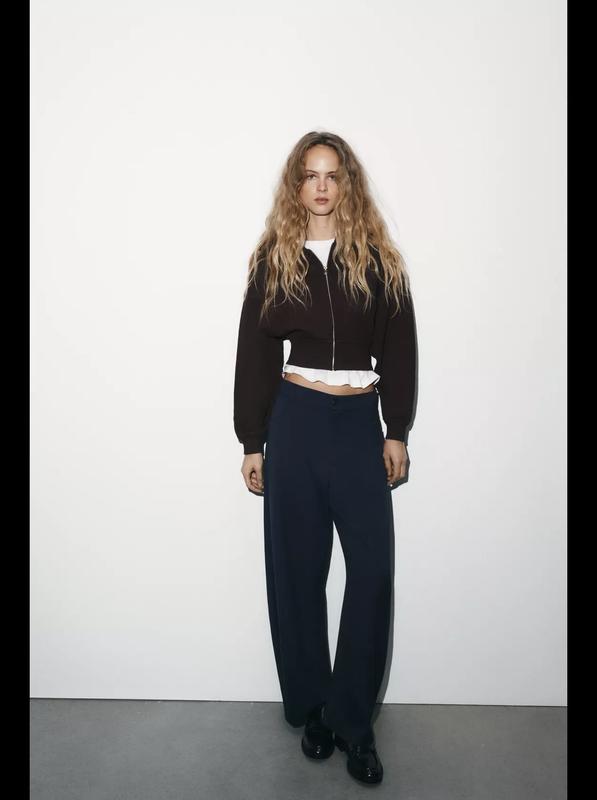 Нові штани wide leg Zara у смужку. Модель з лімітованої колекції, має бірку. Глибокого синього кольору, має у складі вовну. Посадка середня/висока. Розмір М. Напівобсяг талії 38 Посадка 32 Довжина 107 Ширина штанки 32