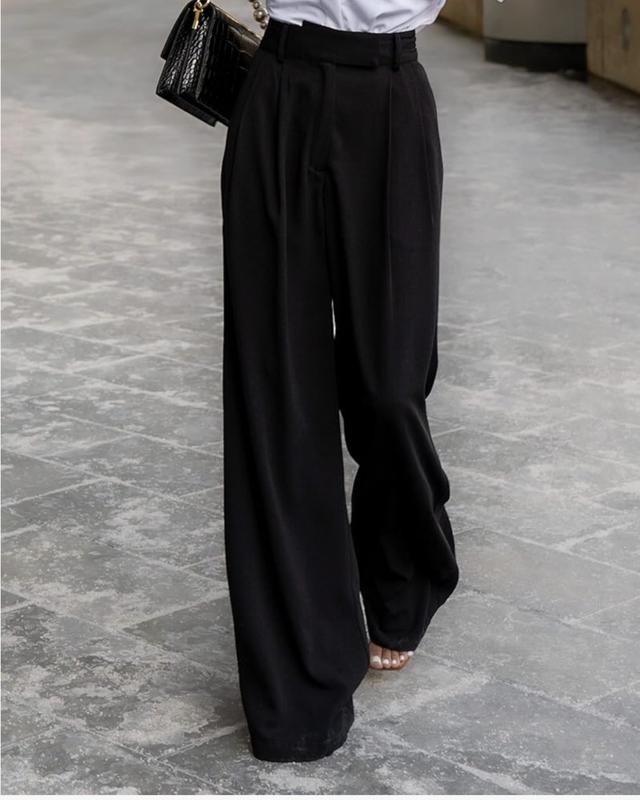 Жіночі штани-палаццо чорного кольору з високою посадкою Ця модель має вільний крій, що забезпечує комфорт та елегантний вигляд. Стиль ласичний, діловий або повсякденний (casual). Дві кишені спереду ✔️довжина 111 см ✔️ПОТ 33 см ✔️ПОБ 57 см