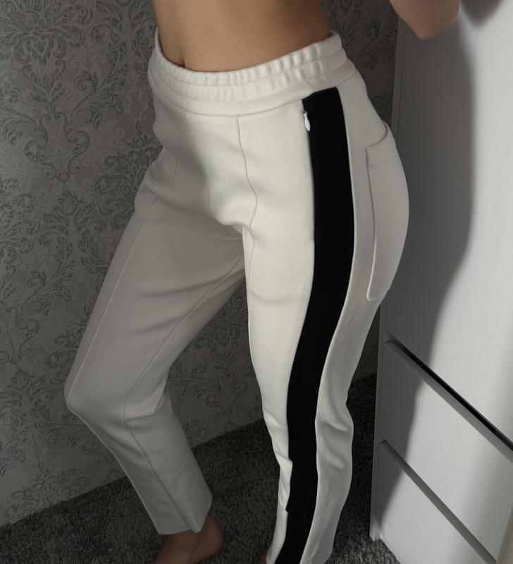 Білі брюки з чорними лампасами від Joseph. Мають кишені на блискавці та одну велику кишеню заду , зручну посадку на резинці. Знизу на штанинах є замки, що додає стилю та дозволяє регулювати ширину. Тканина щільна та приємна до тіла, добре тримають форму. Стан ідеальний. Розмір S–M.