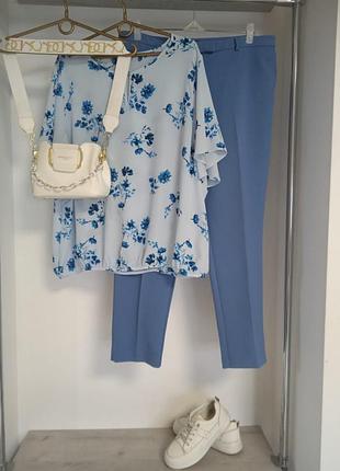 Класичні однотонні брюки насичено голубого кольору. Легкі та комфортні. Цупка, щільна, костюмна тканина. Практично не тягнеться. Лягабть вільно. Є кантики. Висока зручна посадка. Залишився останній розмір. Пот-46 Поб-56 Довжина-96см