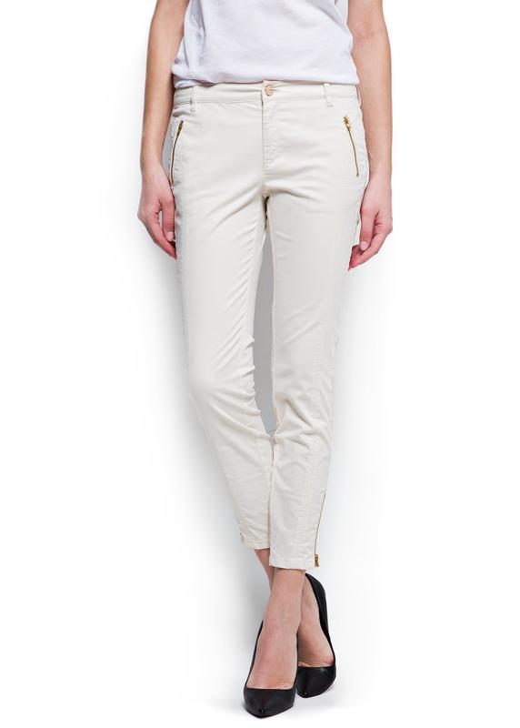 Укорочені брюки з декоративною вертикальної рядком, дві кишені на блискавці спереду і два накладних кишені ззаду. Відкрите кріплення на блискавці на подолах, застібка-блискавка і гудзик .